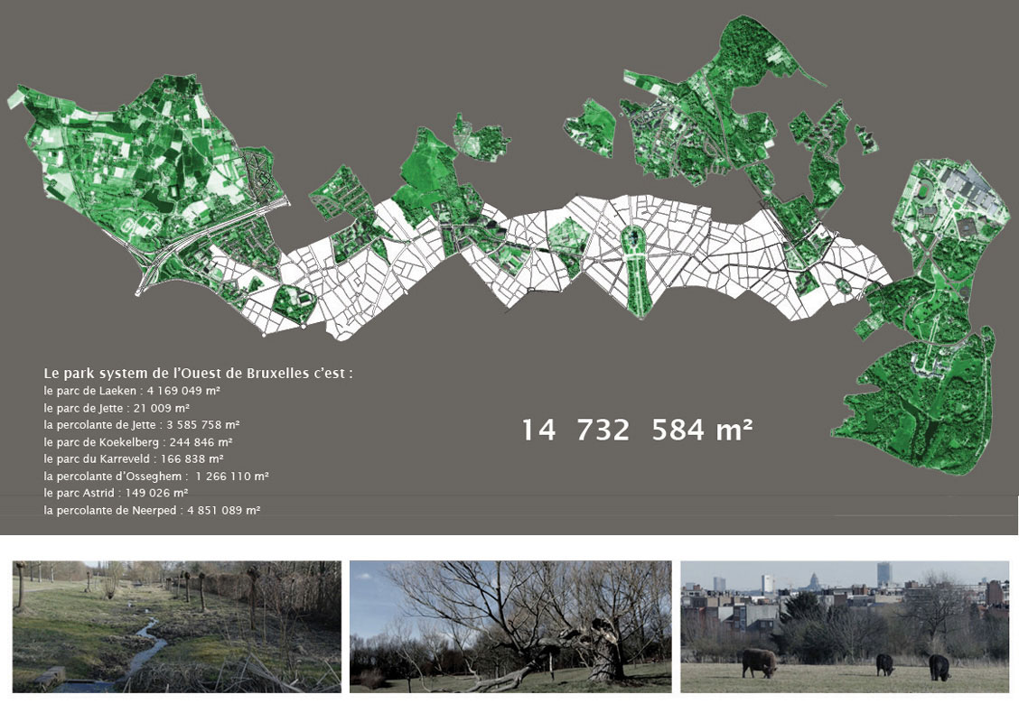 Le projet consiste dans un travail sur l’articulation spatiale de la figure identitaire de l’axe ouest avec les espaces ouverts qui constituent les percolantes.La nécessité du projet s’appuie à la fois sur le manque de structuration et de visibilité de ce ‘parksystems’ qu’il s’agit de signaler et de préserver sur le bénéfice identitaire que constituerait la présence physique de l’ouest dans le panorama bruxellois. Ce projet restructure et met en valeur le vide par l’implantation de tours, qui par leur densité permettent la préservation de ces percolantes ouvertes tout en articulant le parksystem. Il s’agira donc principalement d’explorer l’articulation des premiers étages de ces tours (la partie immergée, invisible depuis le versant est) comportant un programme d’infrastructure public, avec la réalité chaque fois différente du sol - carrefour congestionné d’automobiles ou parc tranquille en bord de boulevard. La tour en elle-même explore les possibilités du logement dense, tout en proposant un rapport au paysage bruxellois, permettant la visibilité des percolantes.